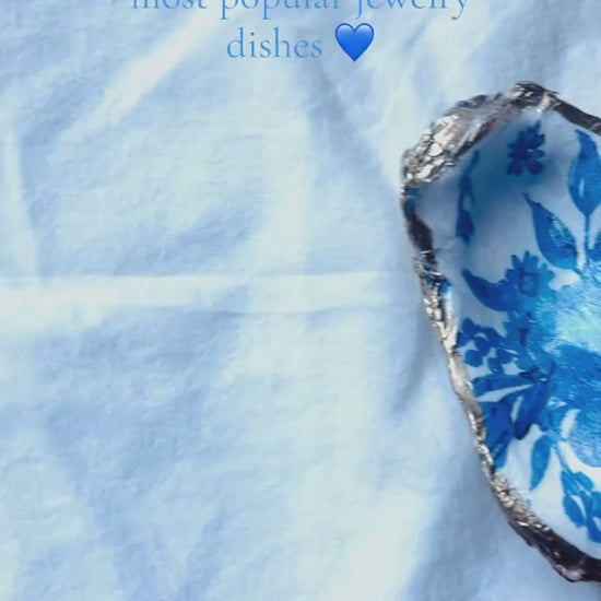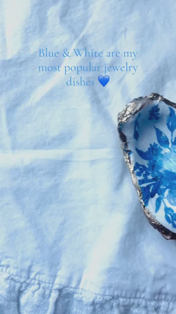 Blue and white floral jewelry and trinket dish with gold leaf edge, back is left natural and sealed.
