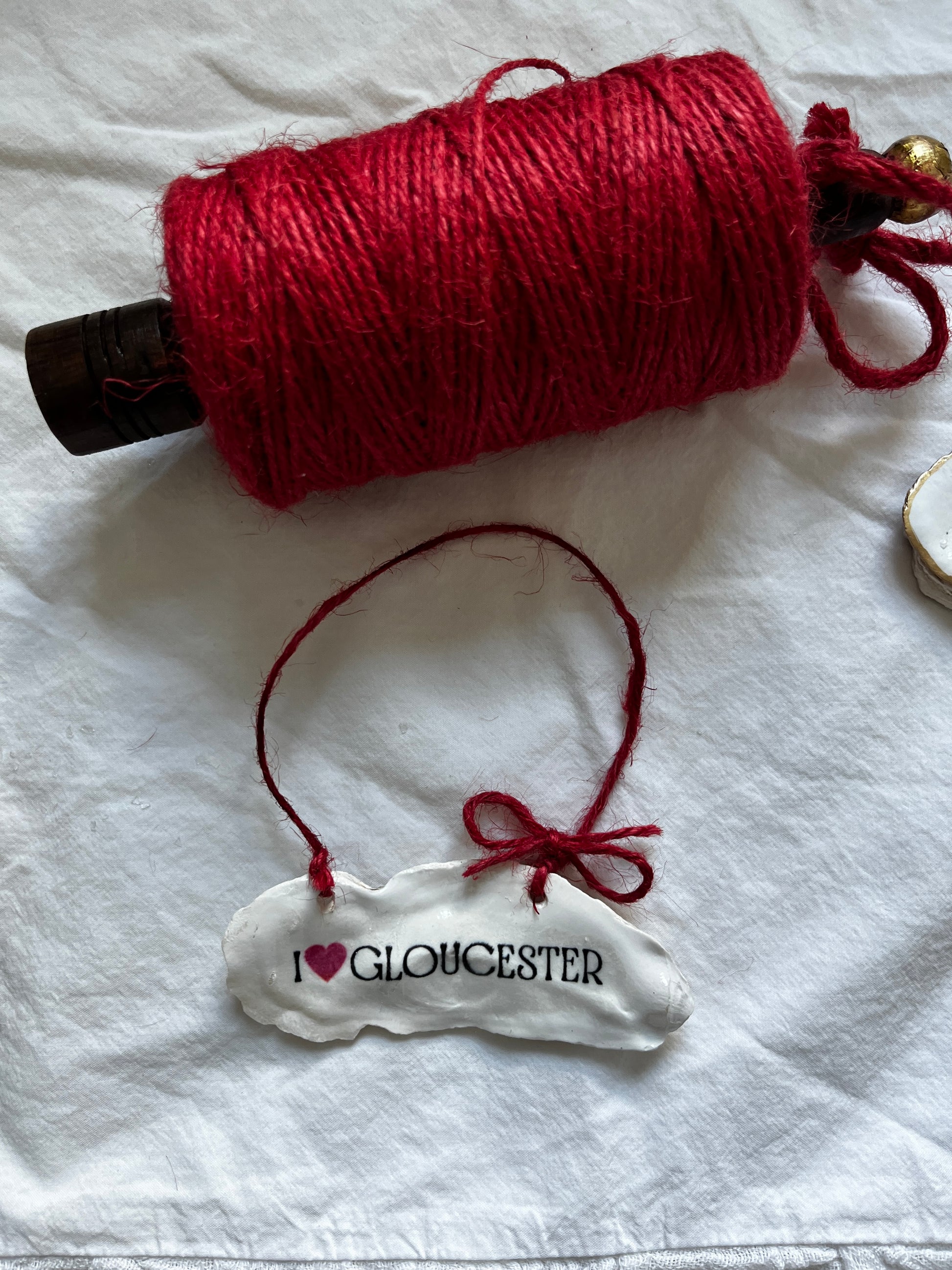 Handcrafted I❤️Gloucester oyster shell ornament. Finished with a red twine tie for a nautical festive touch.