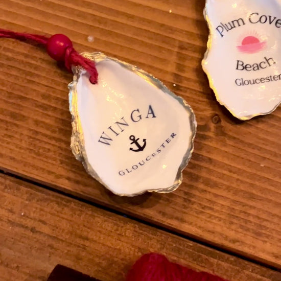 Handcrafted oyster shell ornament with your favorite beach name. Finished in a gold leaf trim, a wooden bead and twine tie for a nautical touch.