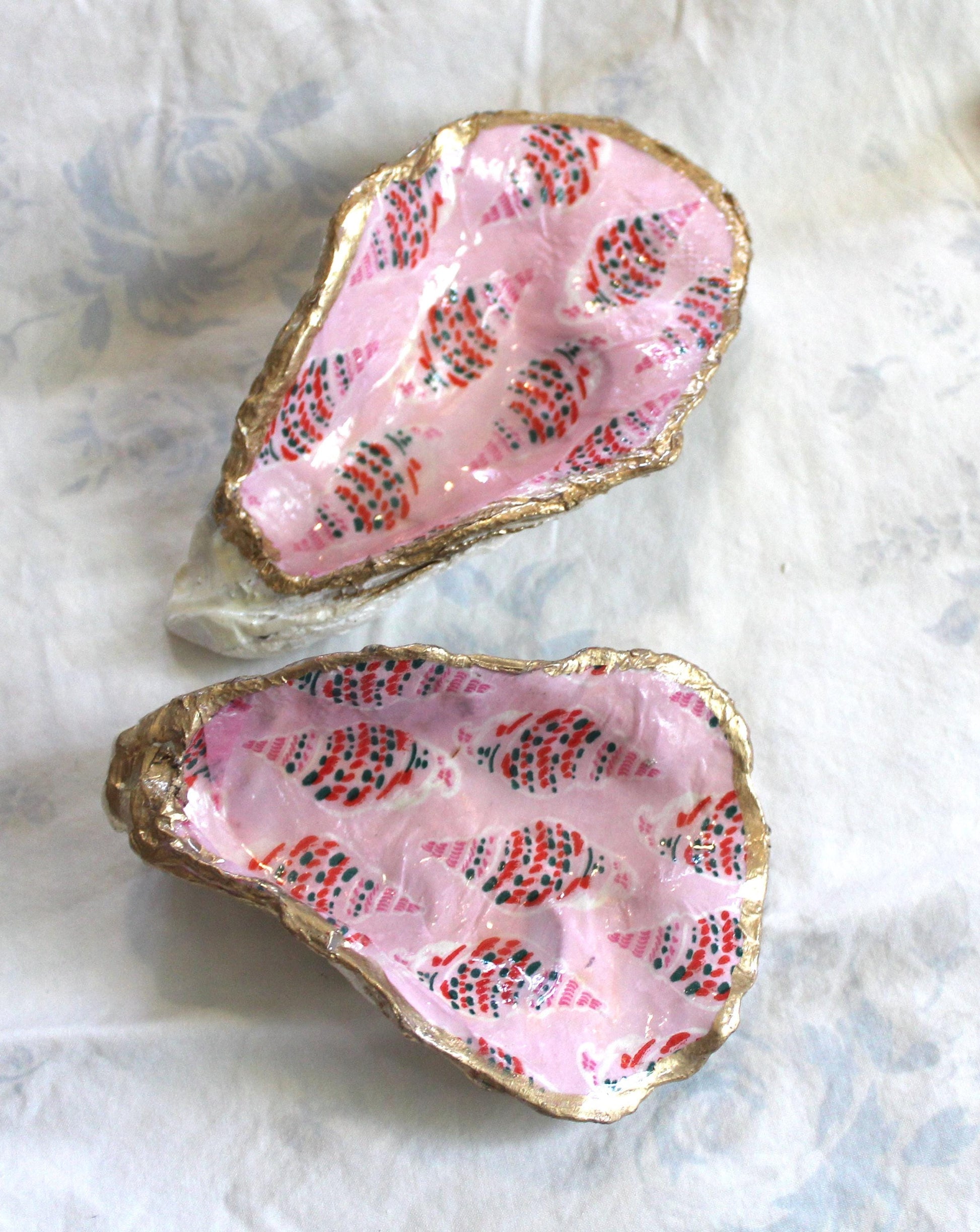 Bring a touch of coastal whimsy to your home with this natural hand-crafted oyster shell with pink seashells and finished in a gold leaf trim. Perfect for holding rings, earrings, or small treasures, this dish is both functional and decorative. No two shells are alike, making every piece a unique keepsake inspired by the sea—an ideal gift for the beach lover.