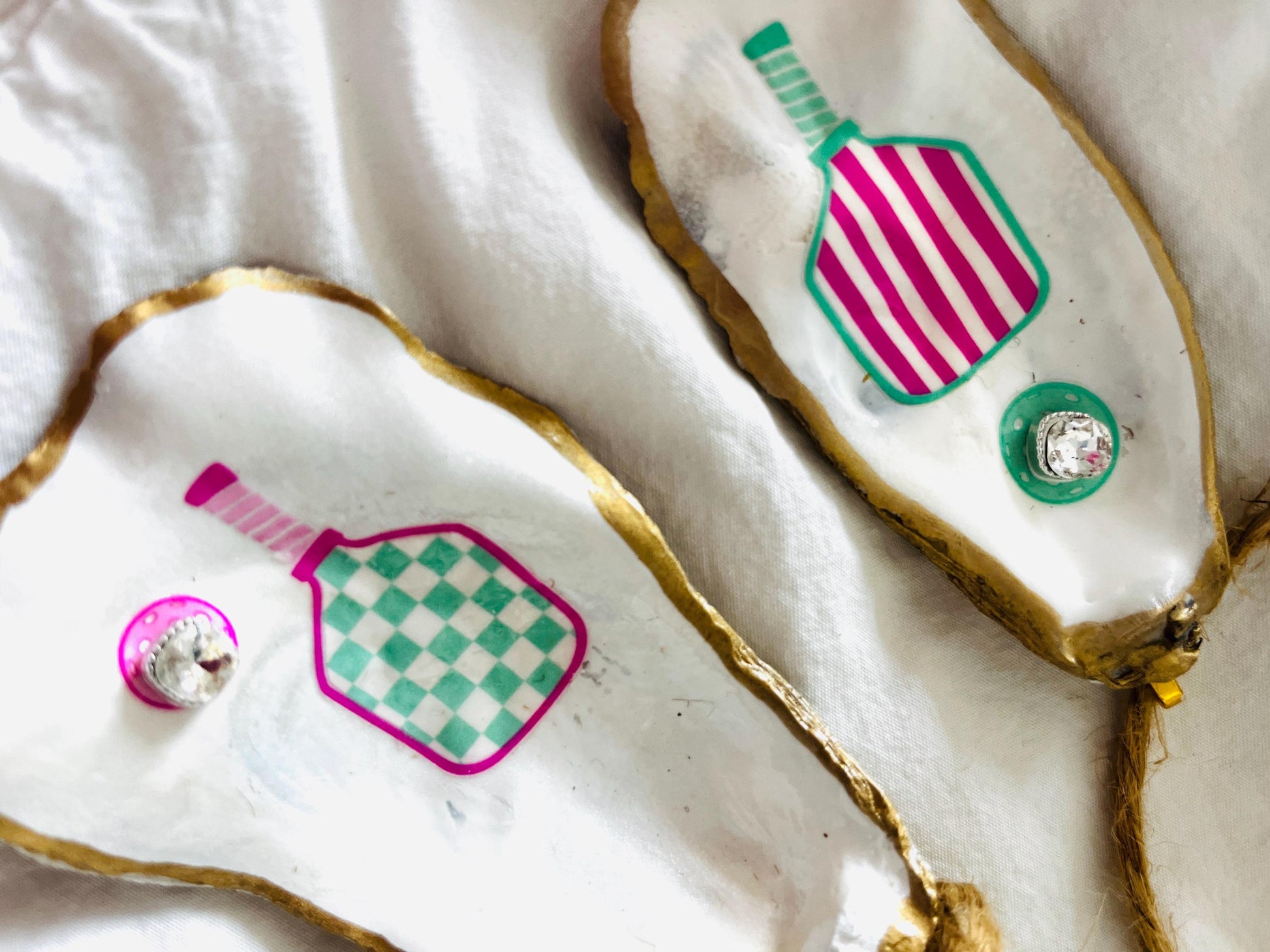 Handcrafted pickleball oyster shell ornament with crystal gem and a gold leaf trim. Finished with gold bail and nautical rope. Makes a perfect gift!