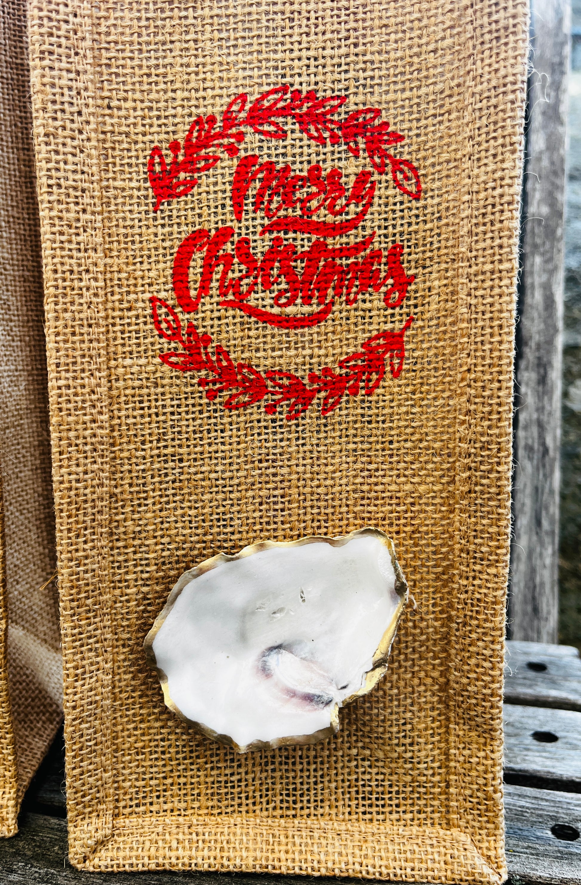 Elevate any bottle with this burlap wine tote featuring a handcrafted oyster shell - thoughtful, coastal, and ready for gifting.